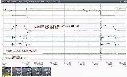 從圖中能夠看出,電流波形在快到電流尖峰時(shí),有個(gè)下跌,這個(gè)下跌點(diǎn)后又有一段的上升時(shí)間,這段時(shí)間其實(shí)質(zhì)就是IC在檢測到過流信號執(zhí)行關(guān)斷后,MOSFET自身也開端執(zhí)行關(guān)斷,但是由于器件自身的關(guān)斷延遲,因而電流會(huì)有個(gè)二次上升平臺,假如二次上升平臺過大,那么在變壓器余量設(shè)計(jì)缺乏時(shí),就極有可能產(chǎn)生磁飽和的一個(gè)電流沖擊或者電流超器件規(guī)格的一個(gè)失效。