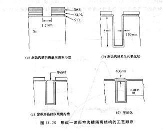傳統(tǒng)的隔離工藝(14,3,l節(jié))有一些缺陷,使得其不合適用于深亞微米(小于o.25μ.m)工藝,硅的高溫氧化與長氧化時間形成用于溝道阻斷的注入離子(對n-MOSFET而言,通常為硼)侵入有源區(qū)域( active region)并招致VT偏移.因而,橫向氧化會招致有源器件區(qū)域的面積減小,此外,在亞微米隔離的距離中,場氧化層的厚度明顯小于生長在寬距離中的場氧化層,溝槽隔離技術(shù)能夠防止這些問題,且已成為隔離的主流技術(shù),圖14. 26顯現(xiàn)構(gòu)成一深(大于3μm)而窄(小于2μm)的溝槽隔離技術(shù)的工藝次第,其包含四個步驟:開出圖形、刻蝕硅襯底、填充介電資料(如二氧化硅或無摻雜的多晶硅)及平整化,深溝槽隔離可用于先進CMOS與雙極型器件及溝槽式DRAM.由于隔離資料是應用CVD淀積,所以不需求長時間或高溫工藝,且能夠消弭橫向氧化和硼侵入( boron encroachment)的問題.