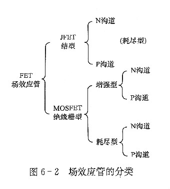 場(chǎng)效應(yīng)管可分為兩類:一類足結(jié)型場(chǎng)效應(yīng)管,另一類是絕緣柵型場(chǎng)效應(yīng)管,也稱MOS管。結(jié)型場(chǎng)效應(yīng)管依據(jù)其溝道所采用的半導(dǎo)體資料,又分為N溝道和P溝道兩種;絕緣柵型場(chǎng)效應(yīng)管除有N溝道和P溝道之格外,還有加強(qiáng)型與耗盡型之分。如圖6-2所示。