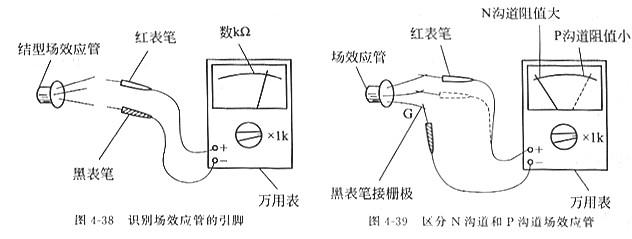 如圖4-39所示,將萬用表置于“RX1k”擋,黑表筆接柵極G.紅表筆分別接另外兩引腳,假如測得兩個電阻值均很大,則為N溝道場效應管。假如測得兩個電阻值均很小,則為P溝道場效應管。假如丈量結果不契合以上兩步,則闡明該場效應管已壞或性能不良。
