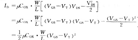 當(dāng)VDS處于OV左近時(shí),精確地說(shuō),是當(dāng)VDS《2(VGS-VT)時(shí),式(1.1)右邊的第2項(xiàng)能夠疏忽不計(jì),能夠近似為下式: