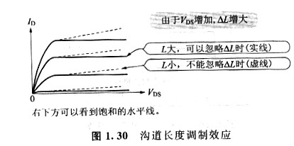 假如MOS晶體管的溝道長(zhǎng)度L變短,那么式(1.12)中的△L就不可疏忽。隨著VDS的增加,△L也增加,使有效溝道長(zhǎng)度(L-△L)變短,因而如圖1. 30所示,漏極電流增加,這叫做溝道長(zhǎng)度調(diào)制效應(yīng)。